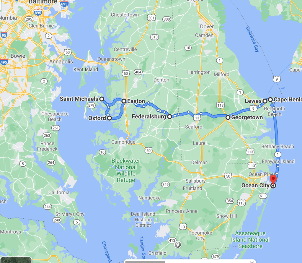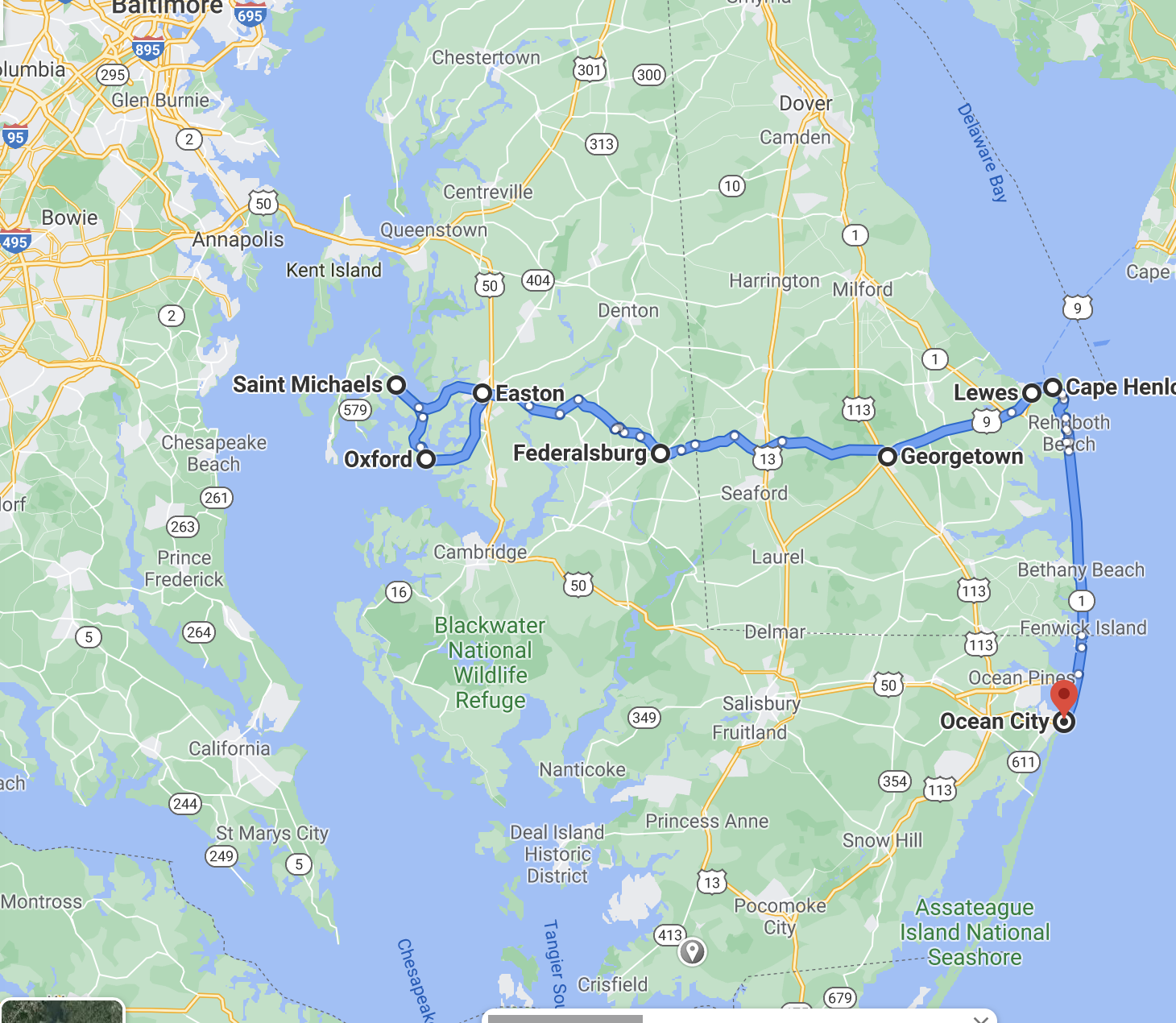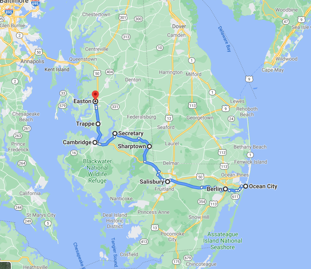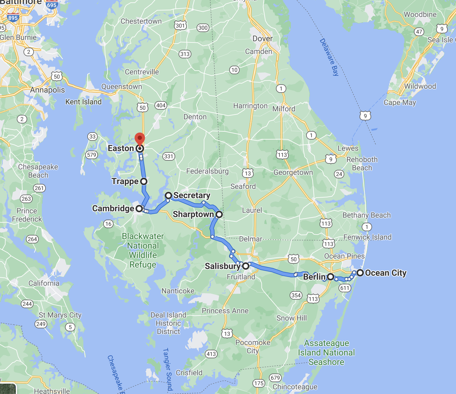 The Maryland / Delaware / Virginia Eastern Shore is also called the Delmarva Peninsula. I wanted to tour some of it by bicycle with my friend Lyman. Back in 1974-78 I went to college on the Eastern Shore: Washington College in Chestertown MD. Chestertown is a quaint eighteenth century town on the northern part of the Eastern Shore. On this current trip we ended up skipping Chestertown. I advocate that many of the best travel experiences are when you and your travel companion discover new people and places; going back to somewhere you have gone before I find often to be a letdown. This trip focused on places neither of us had ever visited, especially the towns of Easton MD, Cambridge MD, Berlin MD, Lewes DE, and the beach towns of Rehoboth Beach DE and Ocean City MD.