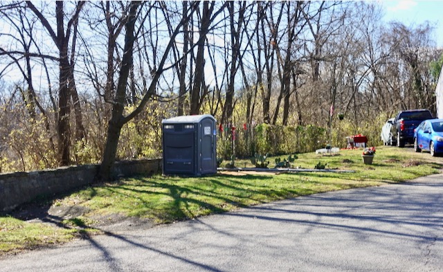 Especially during a pandemic it is difficult to find a bathroom when cycling in cities. Much earlier in the day I needed to go. As I cycled on a residential street through one of those older Roanoke neighborhoods, the houses and street pushed up against a cliff, below which appeared to be a public park. The house at the end of the block had a lot of stuff in the yard. Just beyond what appeared to be the property line between their lot and the park and next to the street stood this port-a-john. Why was this here? Who does this belong to? Was this part of the park or these people’s yard?