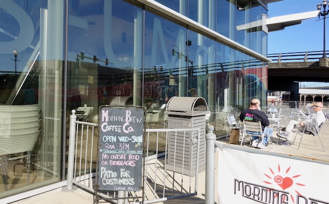 It was past lunchtime. From home in Chapel Hill I had brought a peanut butter sandwich (on whole grain bread from Weaver Street Market!) Downtown right next to the railroad tracks is the Taubman Art Museum which sits behind Morning Brew Coffee Co. I got an almond milk latte and sat outside socially distant, eating my sandwich and peacefully watching the world go by, especially the trains on the adjacent tracks.