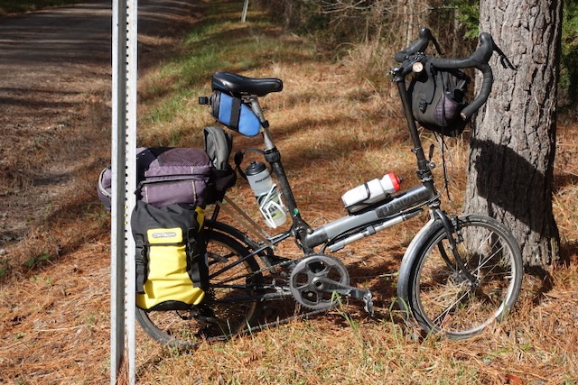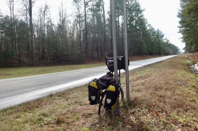 I decided to head south on Sunday morning January 3. My plan was to cycle as far as I felt comfortable, then come back in a rental car some days later. At home in Chapel Hill NC the temperature was about 40F with a slight drizzle. The weather was supposed to clear up after 10:00 AM. I packed up the bicycle and got ready to go. On my bicycle tours over the past ten years I have always been proud of the tiny amount of stuff I usually carry. This was different, I packed not only my usual black trunk bag but also filled both of my wife Tootie’s Ortlieb yellow waterproof panniers with food, stoves, and warm clothing. I could not believe how heavy the bicycle felt; about twenty-two pounds of stuff on the back.