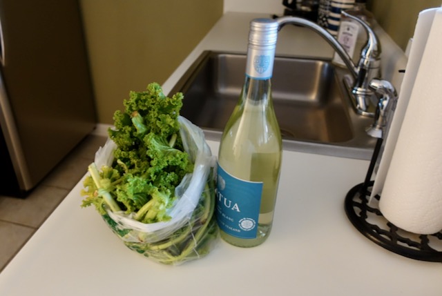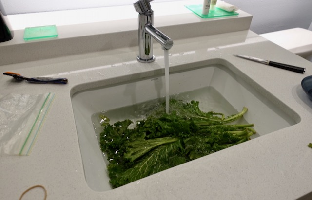 I could start my “cooking in a hotel room” project! I began by wiping down all the surfaces with sanitizing wipes. I washed the kale in the hotel room sink.