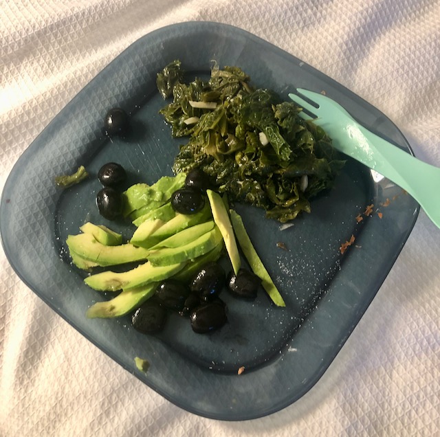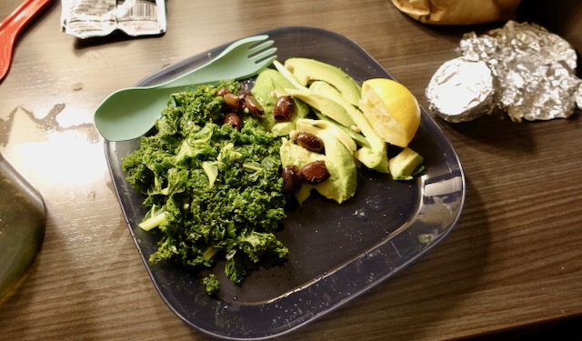 Luckily the room had a refrigerator and microwave. The week before I had bought from REI a backpacking “spork”, a lightweight plastic plate, and a plastic cooking pot. I de-stemmed the kale and used the plastic pot to microwave the kale with a little water and salt. Cooked kale, the avocado, one packet of olives, olive oil, salt and lemon it made for a nice first course.