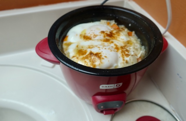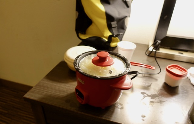 I already own a rice cooker at home and use it 3 – 4 times per week, but it clearly is too big to lug on the back of a bicycle. On Amazon dot com for $19.95 I bought a MINI electric rice cooker. It came to my apartment (of course) in only two days. At just over two pounds it is still a little heavy.