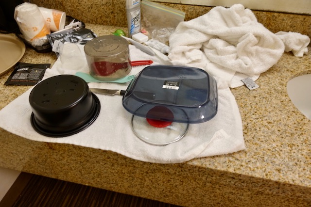 After dinner I washed dishes. Hotels rooms conveniently have lots of towels.