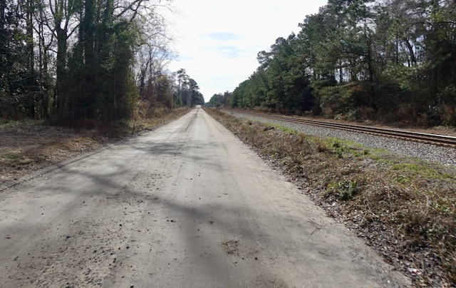 The first half of the day’s bike ride was thirty something miles to Moncks Corner SC. Despite being so close to Charleston the landscape was quiet and solitary, miles and miles of pine forest monoculture, much of it the Francis Marion National Forest. Especially when I was able to get off the main road, there were very few cars.