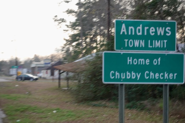 Andrews SC (population 2,800) sits on the edge of vast pine forests. I checked on Wikipedia; Chubby Checker moved from here to Philadelphia at age five, never to come back. I pulled into town as the sun was going down. Some parts of the town looked properous, some parts not. I stopped at its one supermarket to stock up.