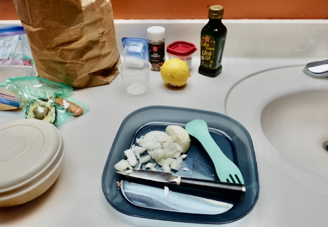 Older motels can be sketchy or not. This one was quite nice. I made a delicious dinner in the motel room. It started by chopping the remaining half of onion.