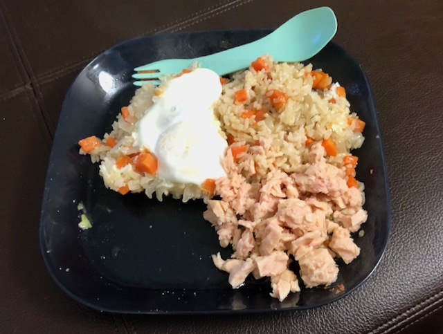 I was so hungry that when I plated the rice and egg I added the can of tuna in olive oil.