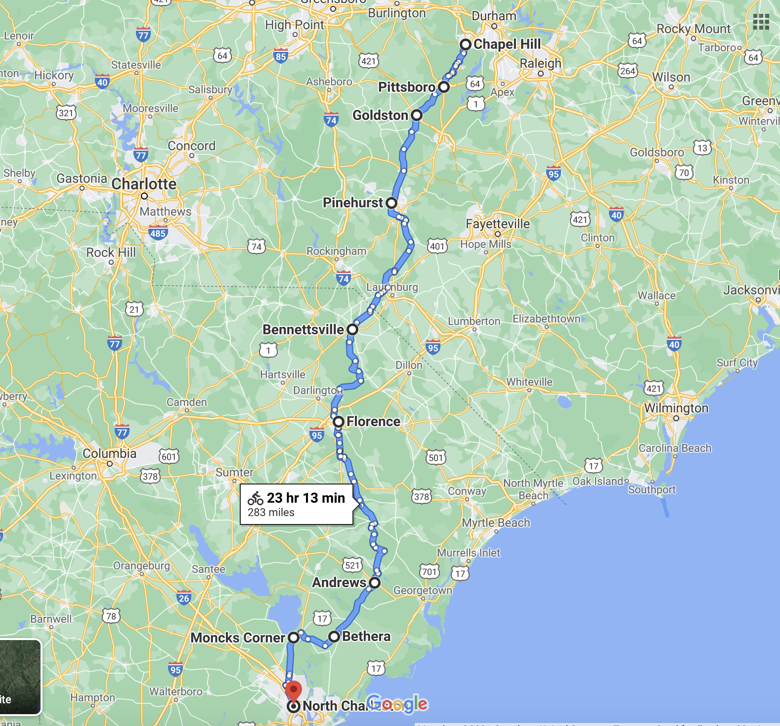 Sometime in the middle of the day I ate my sandwich while pedaling. Eventually I arrived Florence SC (population 38,000) which on a bicycle really feels like a big city. It had been a relaxing day until I had to cycle on the wide open highways of Florence suburbia. The traffic was intense. My brother and sister in law John and Gay live in Florence. My apologies to them for not calling you up while in town. I worried about covid.
