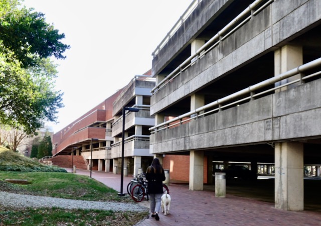 NC State has had an esteemed architecture school for many decades and the modernist spirit seems to effect many or most of NC State’s buildings. Classes were on winter break so I biked through campus with almost no one around. Even parking garages can be fetching.