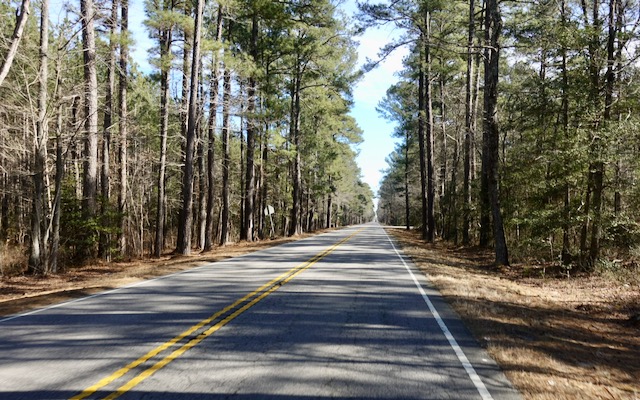 I started cycling down State Route 40 to my first intermediate destination; fifteen miles to Waverly VA, a smooth road with hardly any traffic. Timber and peanuts are the big businesses her. There are miles of pine forests.