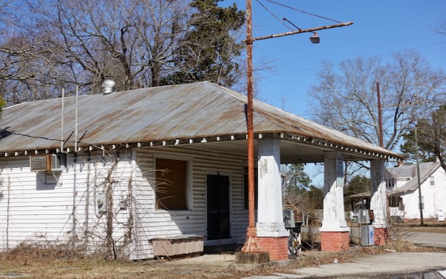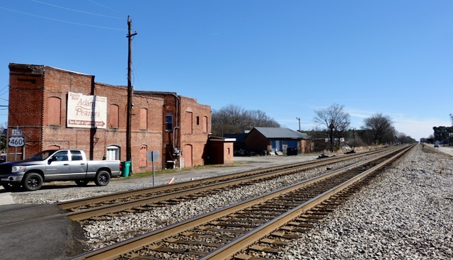 Just a few hundred yards further are the actual main drags of Waverly VA, the parallel four-lane-with-no-center-divider highway US-460 and the railroad: a double track main line of the Norfolk Southern (formerly Norfolk & Western), both stretching the about sixty mile straight shot between Portsmouth and Suffolk VA (near Norfolk) and Petersburg VA (just south of Richmond). Waverly is about halfway. When I was a child my father used to claim that this stretch of rail track was one of the longest straight stretches in the world.