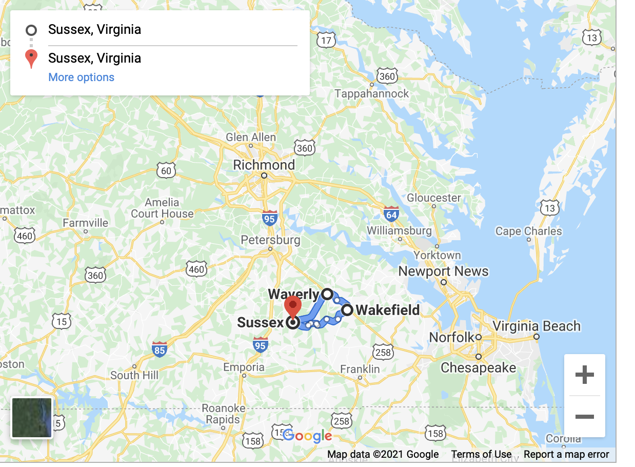 Waverly VA, population 2,100, is the largest town in Sussex County.