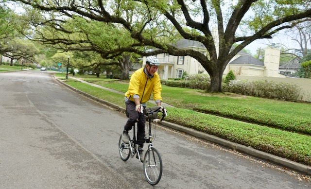 Jorgen wanted to show us parts of prosperous River Oaks so we cycled over there as well. On a flat residential street with virtually no cars the four of us just relaxed while gently cycling and making conversation. The street had a speed bump in it. In a maneuver that all of us bicyclists have done many times, Tom cycling into the paved gutter so as to avoid the speed bump. The gutter had a few wet leaves in it, but they must have been decomposing as they turned out to be incredibly slippery. Tom’s bicycle suddenly slipped and fell over, him landing on his side perpendicular to the street.