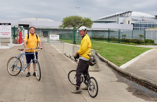 The Astrodome was about America’s first indoor domed stadium when it opened in 1965. The Astros baseball team played there until the year 2000, when the replacement NRG Stadium opened , built in the Astrodome parking lot. Now both stadiums sit side by side. Historic preservationists have wanted to save the Astrodome but all reuse schemes have failed and the old Astrodome is just sitting there, leaking. There is a fence around the whole compound so Tom, Lyman, and I could not bicycle as close as we would have liked.