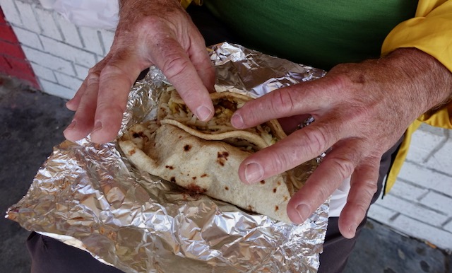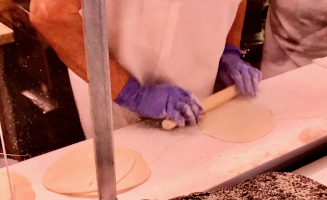 Indoors there was a long line of Mexican looking people masked and waiting patiently for what appeared to be sausage and egg tacos, starting with tortillas rolled out from scratch, then a selection of fillings. Whatever the filling, they started with a smear of refried beans.
