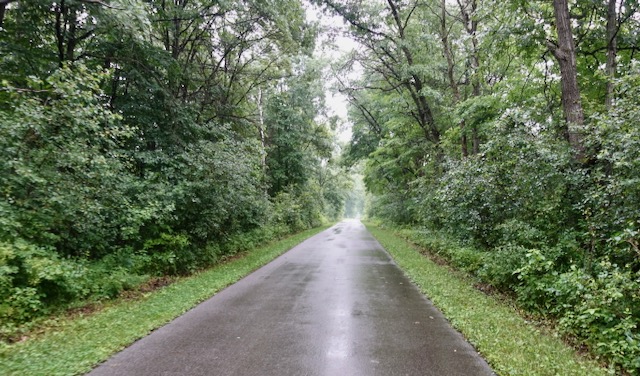 It was over forty miles to Michigan City, Indiana where we knew there were hotels. The map showed rail trails almost the whole way. Unknowingly we were succumbing to the frog-in-boiling-water trap. We cycled through an hour or more of drizzle so light as to be barely noticeable. That transitioned to light rain, we pretended not to care. By the time we had cycled into more remote wooded areas the light rain transitioned to heavy rain. Lyman had on a nice Showers Pass brand jacket of Gore-Tex like fabric and I had just a cycling shirt, but both rainwear strategies were failures. We both got very wet and were overcome with shivering if we stopped exercising. I could no longer take photos because I had to keep my phone and camera dry.