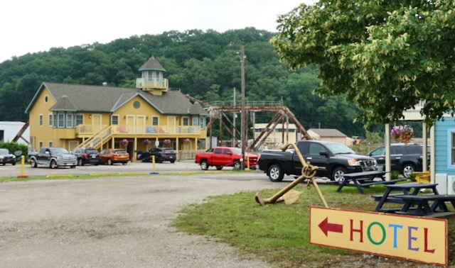 We thought we would have to subject ourselves to further danger and humiliation by having to cycle two miles on a major highway in the rain out to the Interstate Highway interchange, where the only motels on the Hotels Dot Com app were clustered. Michigan City, Indiana is a faded lakefront industrial town about five miles from the Michigan state line. Its claim to fame is that it is the home of Indiana State Prison. Standing under a restaurant overhang to stay out of the rain, at the last minute I located one possibility on Google Maps in downtown Michigan City, the Bridge Inn. I phoned from a few blocks away. Yes they had one apartment suite left, two single beds. They had no office but the guy would meet us in the parking lot. The room suite and the hotel turned out to be quite nice. I took this photo the next morning after it had stopped raining.