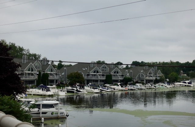 The apartment had a great television and was really spacious. It even had a fully stocked kitchen for us to make our own breakfast the next day. It turned out that the two restaurants those guys had told us about were really the only places to eat dinner in Benton Harbor. This must say something about America. The one restaurant that was open was Houndstooth, a fancy place with entree prices over thirty dollars. It sounded good but we were just not in the mood for Big Food, at least not this day. The other place The Livery which features pizza, sounded great but was closed on Mondays. We had to carry the bicycles down the stairs to the street and cycle a couple of miles to the restaurant of a hotel in St. Joseph. It looked out over the harbor. It was crowded, with a long line to get a table. We discovered almost no one was at the bar around the hotel swimming pool, where we learned we could order food. A shared charcuterie plate really hit the spot.