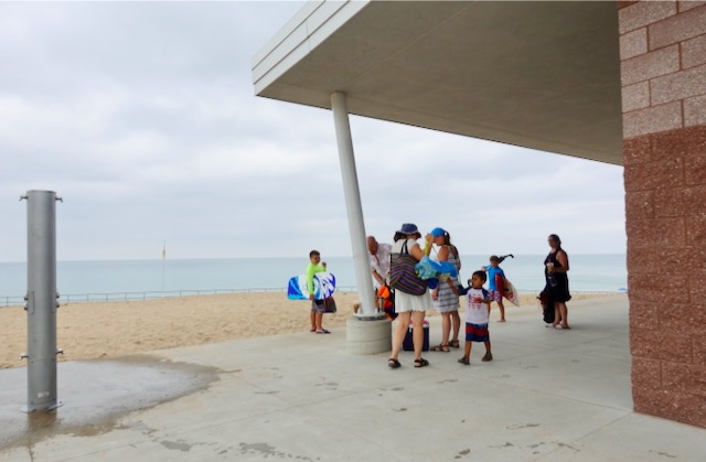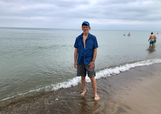 We headed south. We soon stopped near the Chicago neighborhood of Hyde Park, just south of downtown, and checked in with our friend Bob. Bob and his wife Helena normally live in Tampa FL; his wife Helena grew up in Hyde Park. Bob and Helena were in town to fix up the apartment she had inherited from her late parents and Bob met us at the lakefront. He showed us the spot where Helena has done long distance swims in the lake. We chatted for half an hour, but Lyman and I had to get pedaling. It was about 5:00 PM and we still had a long way to go.