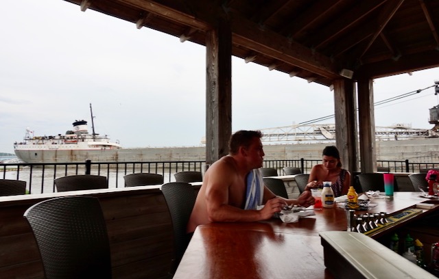 From our pool bar vantage point we enjoyed watching a huge Great Lakes freighter departing from the harbor. We did not know but wondered what specific cargo this Canadian flag vessel had discharged here. We imagined the ship must look a lot like the Edmund Fitzgerald, in Gordon Lightfoot’s song, also a huge single purpose vessel built to carry one bulk commodity on normally flat seas.