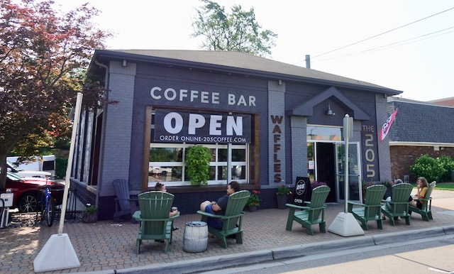 Holland MI is aptly named, as it was settled by Dutch religious fundamentalists (also described as Dutch Calvinist separatists) starting in the 1840’s. A significant percentage of the population of the Holland / Grand Rapids area still claims Dutch heritage and religious tradition, including Trump’s Secretary of Education Betsy DeVos. I had heard that Holland MI has such a vibrant downtown that many people come to visit just for the urbanism. We cycled into downtown Holland and found this pleasant looking local coffee place. We stopped and got a latte, sitting outside in those wonderful plastic Adirondack chairs.