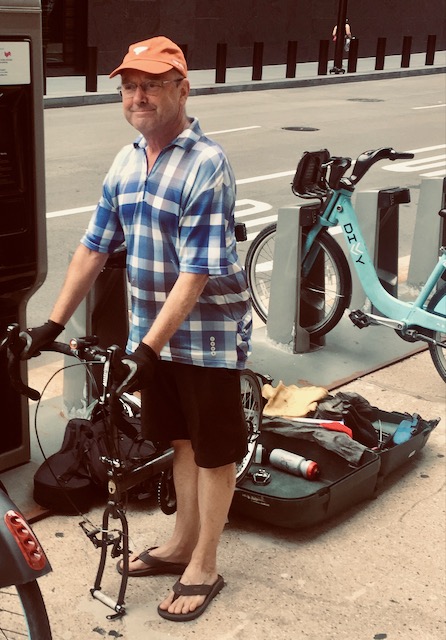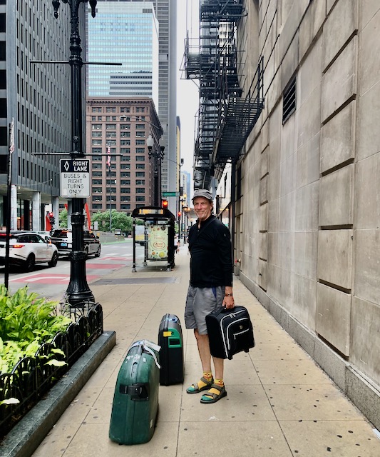 Both flights were scheduled to land about the same time on a Saturday morning. We planned to meet at O’Hare airport at 10:45 AM, each of us having checked a Bike Friday in a suitcase. On arrival I exited my airplane, walking toward baggage claim. It had been weird to be wearing a mask for such an extended period.