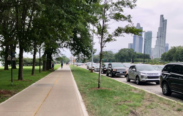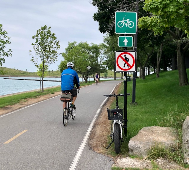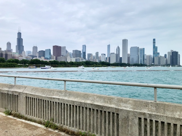 It took about half an hour for us to put the bicycles together and be ready to go. We dropped off the empty suitcases at the storage spot, a Seven-Eleven (!). We took off by bicycle, first eastward towards the lake, then south along the lakefront. We each were carrying a small trunk bag as our luggage for five days. Lakefront Trail is a godsend for bicyclists. On other trails in other cities I have noticed constant near collisions between pedestrians and cyclists on these paths. Along the lakefront Chicago has constructed separate trails for walking and bicycling. They prohibit pedestrians on the bicycle trail.