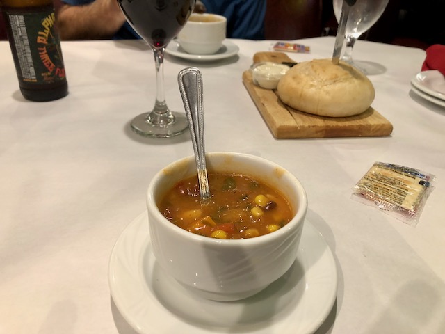 Dinner at the very old school Freddy’s Steak House in central Hammond IN was only just OK. In hindsight we were too creative with our orders (grilled lake perch was fresh tasting but not filling enough; Lyman’s steak sandwich was leathery.) We should have split a large steak instead. The universal first course of bean soup was likely out of a can but still satisfied on this chilly evening.