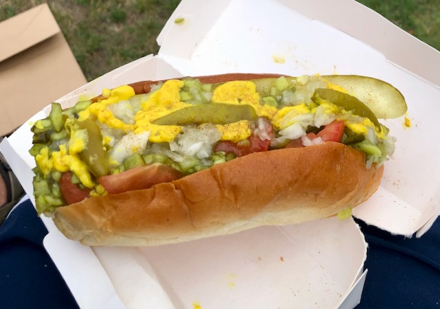 There was a coffee place downtown and we got lattes. We also found a bike shop for some chain lubricant. We wanted some kind of light lunch. What to look for? Tacos, especially since Lyman came here from Texas, seemed destined for failure. Why not that Midwest standout, the hot dog? A walkup hot dog place in Saugatuck had all sorts of styles, each with the same price of five dollars. Lyman got the Detroit style (chili and onions), I got Chicago.