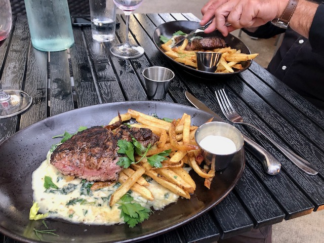 The restaurant had a huge open interior space, full of people eating, which is a good sign, and it had outdoor seating available, which made us more comfortable in these Covid times. Lyman really wanted the steak frites, even though the price of $52.00 was, in my mind, insane. We told the restaurant we wanted to split the steak frites and it was actually perfect, both portions plenty to eat and nicely presently as if ordered separately. With a split fried calamari appetizer and a split $ 36.00 bottle of pinot noir, the whole meal was not ridiculously expensive.
