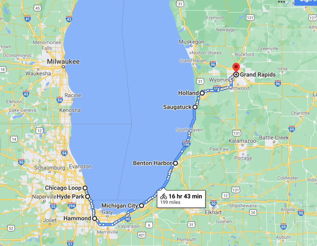 It was time to get back on the road. I had been thinking of bicycling from Chicago to Grand Rapids, Michigan for several years. I knew almost nothing of the area, other than there is an easy direct Amtrak train the two hundred miles from Grand Rapids MI to Chicago. Why not fly to Chicago, bicycle to Grand Rapids over several days, then return to Chicago by Amtrak?