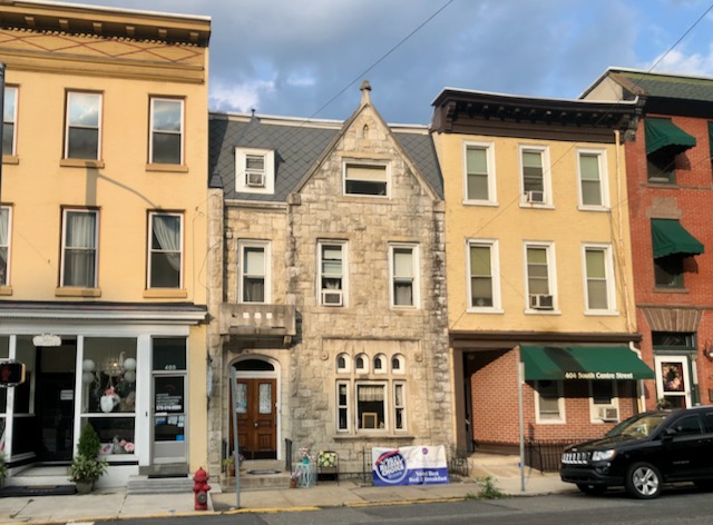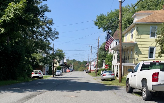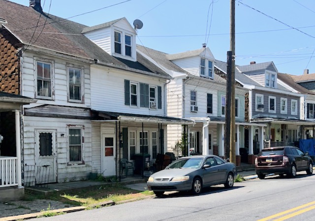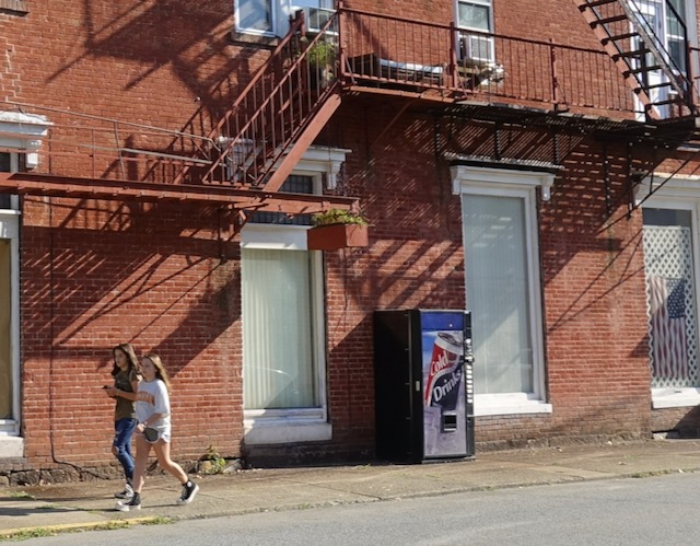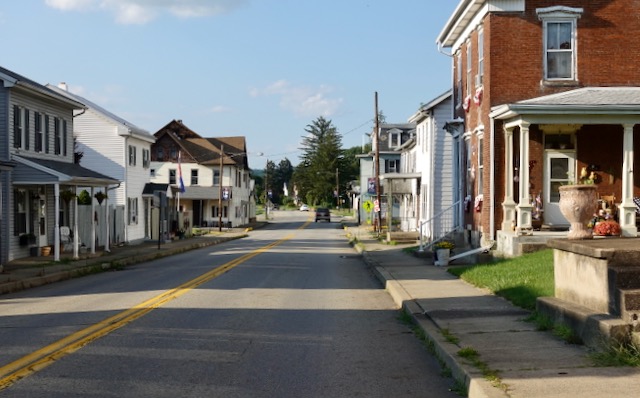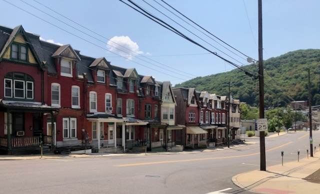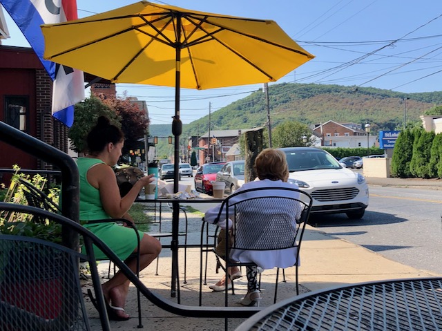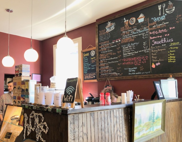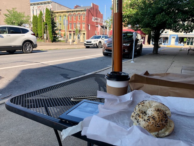 Danville PA (population 1860: 6,500; population 2020: 4,500) had an attractive but decaying inner city. I could not find specifically a coffee house but Old City Bagel Company worked fine.