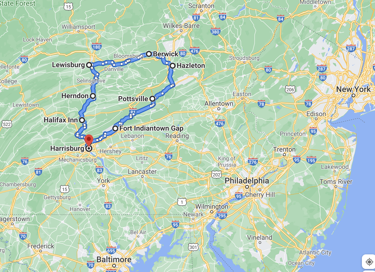 This is the 200+ mile loop I would bicycle over six days, making up my route as I went along. In North Carolina the geography is pretty simple; there are mountains in the west, rolling hills Piedmont in the middle and flat coastal plain in the east. Pennsylvania geography is much more complicated. Mountains are strewn all across the state, most of them running in ridges from the southwest to the northeast. My first three days in Pennsylvania I cycled north from Harrisburg to Lewisburg to Berwick along the Susquehanna River and the bike ride was mostly flat, but with hills or mountains rising steeply from both sides of the river. Coming back through Hazleton and Pottsville I had to bicycle over real mountains.
