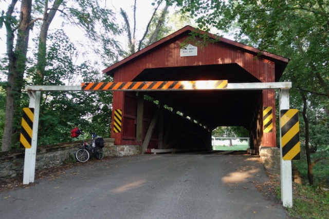 At 7:30 AM, for the first time in my life, I cycled across a covered bridge. This one was built in 1830.
