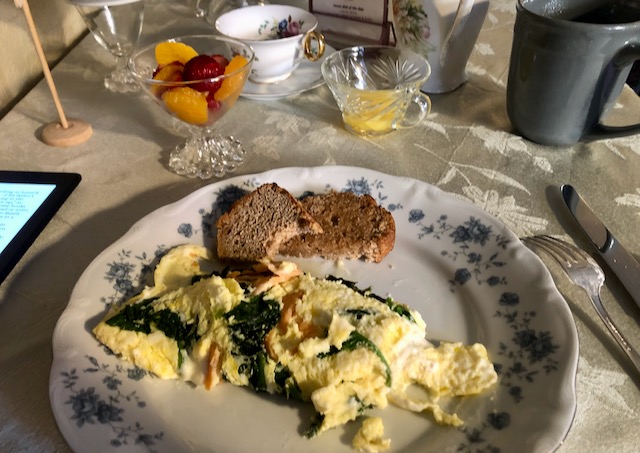 My hostess specifically asked if I wanted breakfast earlier than the normal 8:00 AM the next day. What could I say but yes! It was going to be a hot day I had to get an early start. I was by myself in the dining room at 7:30 AM. Fresh fruit + eggs with spinach and smoked salmon, all cooked solo by the proprietor.