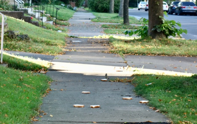 A very old looking man was sitting on his porch Frisbee-ing pieces of bread out onto the sidewalk. I guess he wanted to watch the birds.
