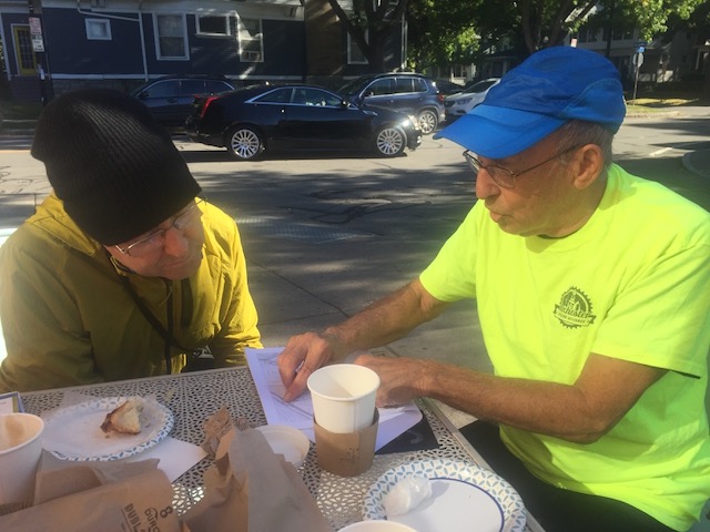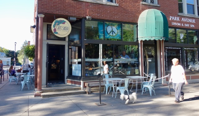 then to Cafe Sasso on the wealthier southeast side of town for breakfast with a bicycle touring hero of mine who lives in Rochester. I had met him on Amtrak a few years ago. Harvey Botzman has circumnavigated all of the Great Lakes by bicycle, some more than once, and he has written books about it.