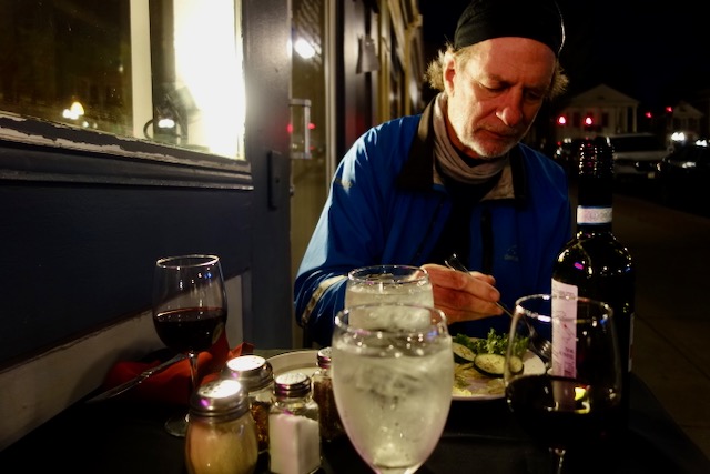 We went looking downtown for a nice meal where we could eat outside. The temperature was in the low sixties but we had hats. Many of the restaurants in town were closed on this Sunday night. At Bella’s Sicilian Ristorante and everywhere else in Geneva NY no one else seemed to care about COVID and the other patrons were jammed indoors unmasked. At Bella’s one table on the sidewalk Lyman and I split an eggplant parmesan (pasta and side salad included) and a bottle of wine. The service was prompt and friendly. Like most mainstream Italian restaurants in America, a portion for one is really a portion for two, especially if you get an extra salad. This was my favorite kind of food and a very good deal. I could do nothing but leave them a big tip.