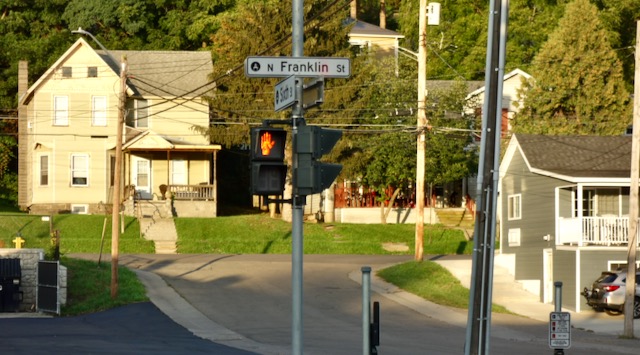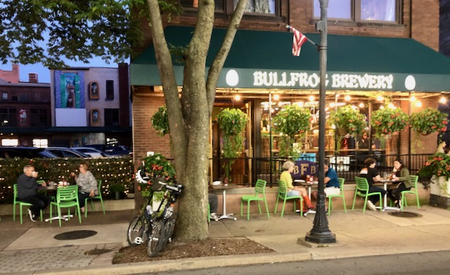 A little later we bicycled the mile or so to downtown Williamsport, once again looking for somewhere to eat, but also to eat outside. It was Friday night and the restaurants were really crowded. Drinking beer and having dinner on the sidewalk outside the Bullfrog Brewery was a great time although the food was only just OK.