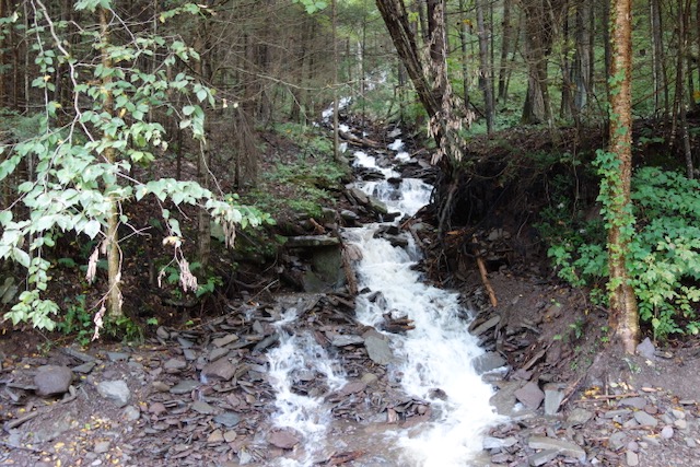 Steep slopes rose from the left side of the trail, and impromptu waterfalls cascaded down. There had been a lot of rain but the sun was now coming out.