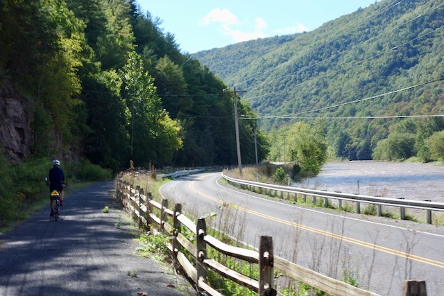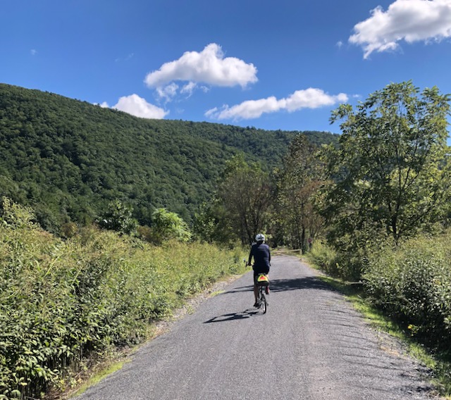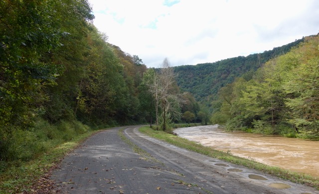 The Pine Creek Rail Trail is sixty-two miles long with its northern terminus just three miles from Wellsboro. It follows the Pine Creek Gorge for almost its entire distance. For most of the area there is no cell phone coverage at all. As we started cycling down the trail we were surprised as to how well it is maintained with smooth fine gravel or pavement the entire distance. We planned to cycle the trail in two days and had a reservation at an inn at about the halfway point.