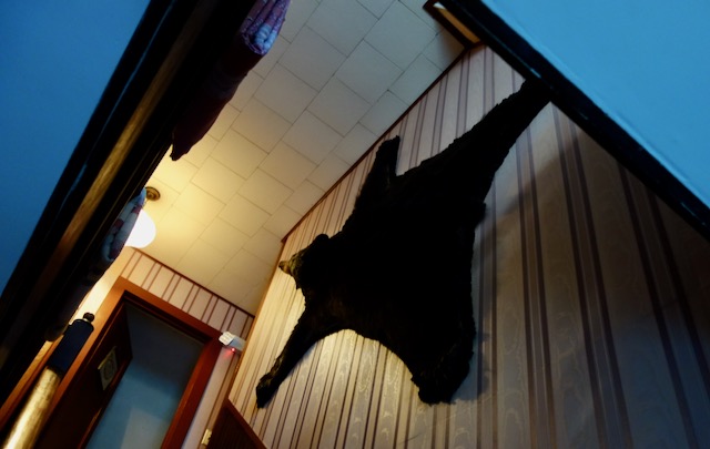We were given separate small rooms upstairs with a bathroom down the hall, passing a bear skin on the way up the stairs.