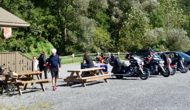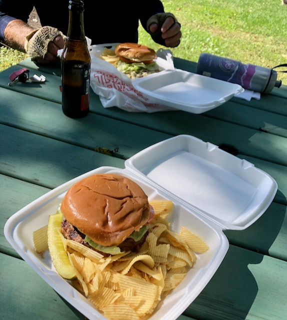 Pine Creek empties into the Susquehanna River at the incongruously named town of Jersey Shore PA and our Pine Creek Rail Trail ended there. We had not passed anywhere to eat all morning but near the end of the trail we arrived at what turned out to be a biker bar. (Motorcyles!) We got two cheeseburgers. Yes, several guys looked vaguely threatening but I passed this off as a style issue. Lyman was more concerned, we took our sandwiches and beers to a table out by the trail.