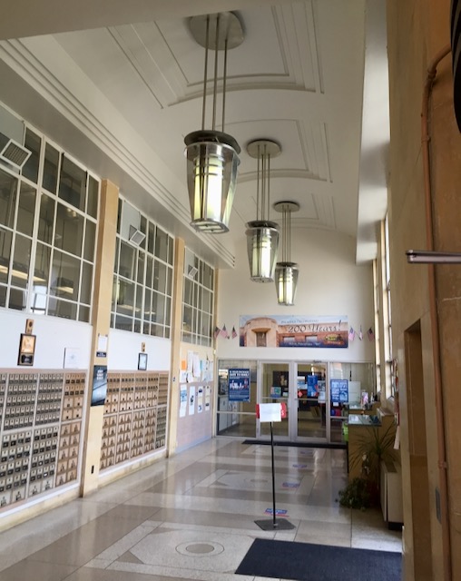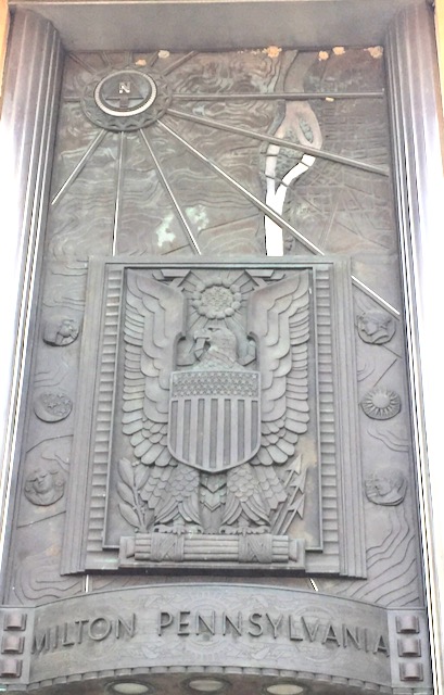 Melinda dropped us off. I gave her a twenty dollar bill which she did not ask for. We had only fifteen miles to cycle back to my car that had been parked for a week in Lewisburg PA. While Lewisburg seems a prosperous town with the vibrancy of having Bucknell University, just north of Lewisburg the town of Milton has seen hard times. Milton must have once been an important place because in the 1930’s the U.S. Postal Service chose to build a certainly expensive and lovely Art Deco post office with likely original artwork. Lyman insisted that we go inside. As a retired historic preservation architect he was impressed that the Postal Service has kept the building mostly original and intact. (photos by Lyman)