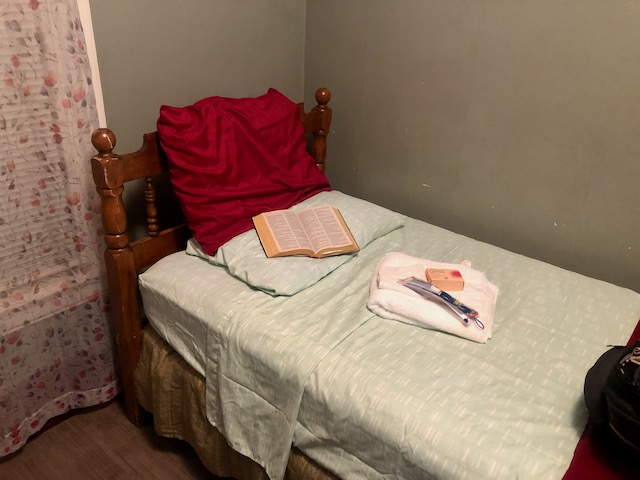 Both rooms opened directly onto a kitchen whose refrigerator was stuffed with other people’s food. There was a Jamaican flag on the mantlepiece in the other room. Another guy, who seemed perfectly nice but whom we did not know walked into the kitchen, he was staying here as well. Across the kitchen was the shared bathroom for the three of us.