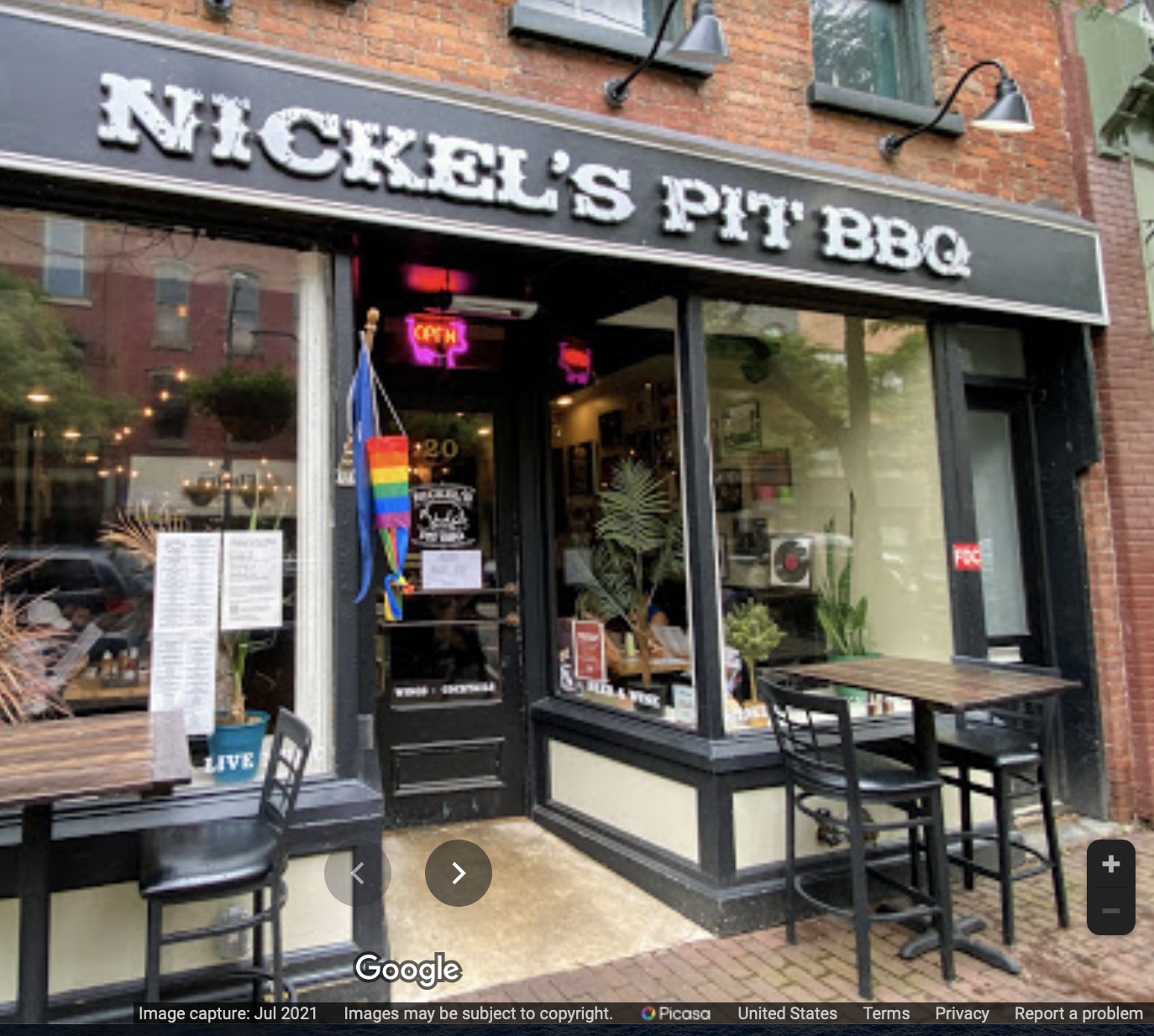 It was about dark when we starting cycling back across the river to downtown, looking for a place to eat. We went to Nickel’s Pit BBQ because we could sit outside and almost everywhere else was closed. Lyman (originally from Louisiana) swears the sandwich we split called The Cajun was the best thing we had eaten on this trip, even though the sandwich had little to do with Louisiana. New York State barbecue joints do not feel constrained the “rules” of barbecue of more famous barbecue states. This place also charges fifteen dollars for a sandwich. Ouch.