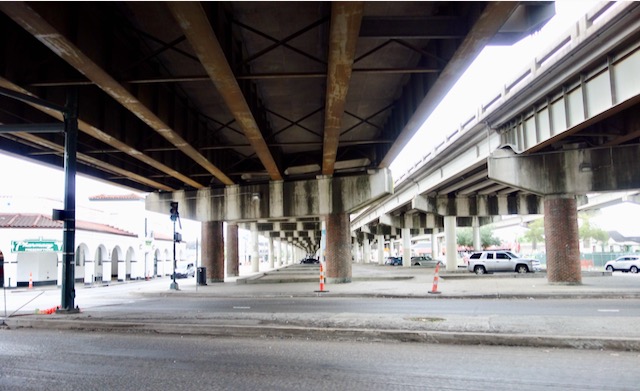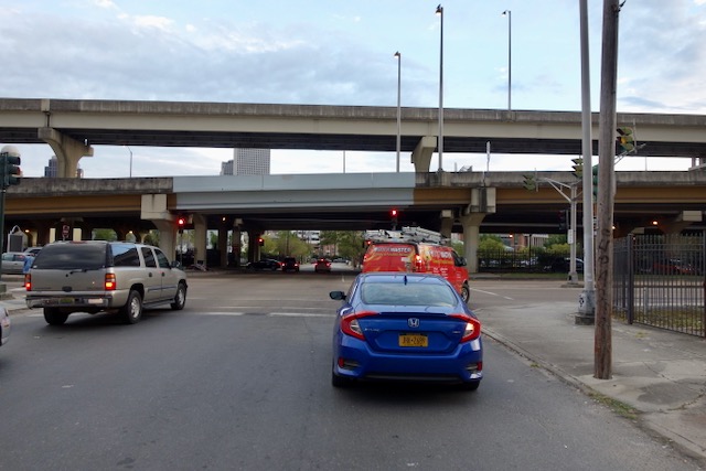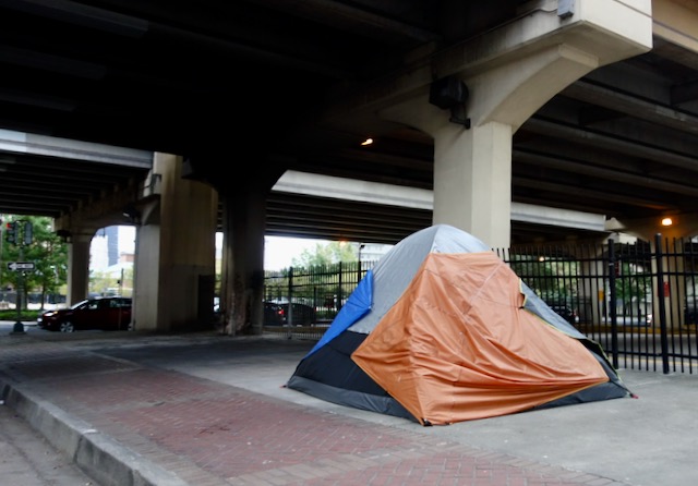 Six or eight blocks further Carondelet Street passes under a freeway. Dozens of homeless people have moved underneath the overpass.