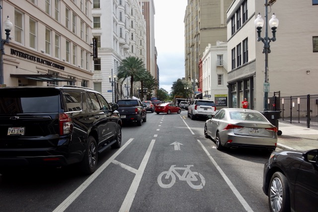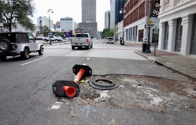 City bicycling in New Orleans is wonderful but one does need to keep one’s eyes affixed to the road. Potholes are everywhere.