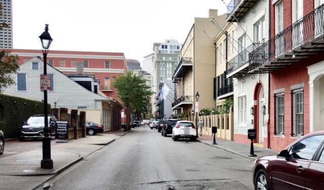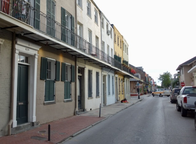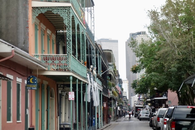 Downriver across Canal Street is the French Quarter. Burgundy Street through the French Quarter is an excellent street to bicycle on. There are almost no bumps or stop signs.